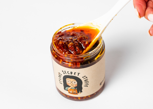 the "secret stufff" is my version of a homemade chili oil that is rich with flavor and just the right amount of spice. each batch is carefully prepared with the freshest ingredients. made with olive oil, thai chili peppers, habañero peppers, garlic, and shallots, this is more than just your average chili oil.